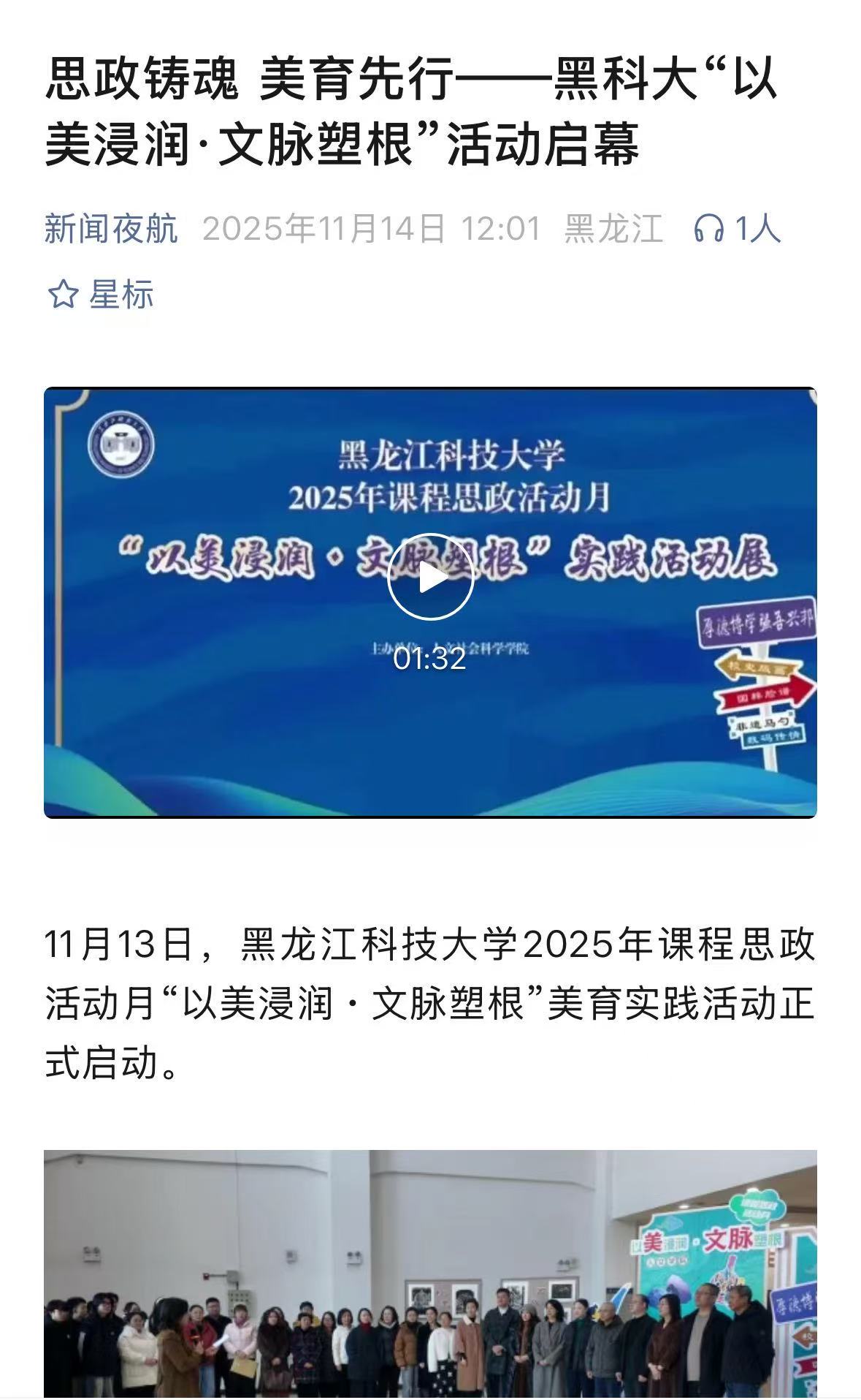 11月13日,学校2025年课程思政活动月“以美浸润・文脉塑根”美育实践活动正式启动,教务处和校团委相关负责人,校副总督学、校院两级督学及人文学院中青年教师和学生代表出席本次活动。《新闻夜航》栏目对本次活动进行了报道。本次活动由人文学院主办,这既是深度践行新时代美育教育浸润行动,又是对学校“五育并举”人才培养体系的一次生动诠释。“美育与思政教育同以立德树人为根本任务,以文化传承为核心使命。”教务处副处长关凤岩介绍,本次活动正是二者深度融合的鲜活载体,彰显了“以美育德、以文化人”...