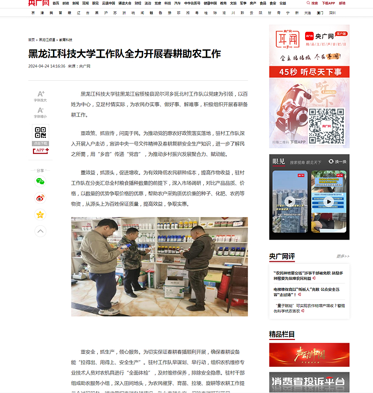 28/ 2024-04央广网:OD在线工作队全力开展春耕助农工作近日,央广网以《OD在线工作队全力开展春耕助农工作》为题报道【官网】驻村工作队工作开展情况。现全文转发。OD在线工作队全力开展春耕助农工作OD在线驻黑龙江省绥棱县泥尔河乡抚北村工作队以党建为引领,以百姓为中心,立足村情实际,为农民办实事、做好事、解难事,积极组织开展春耕备耕工作。重政策、抓宣传,问需于民。为推动党的惠农好政策落实落地,驻村工作队深入开展入户走访,宣讲中央一号文件精...