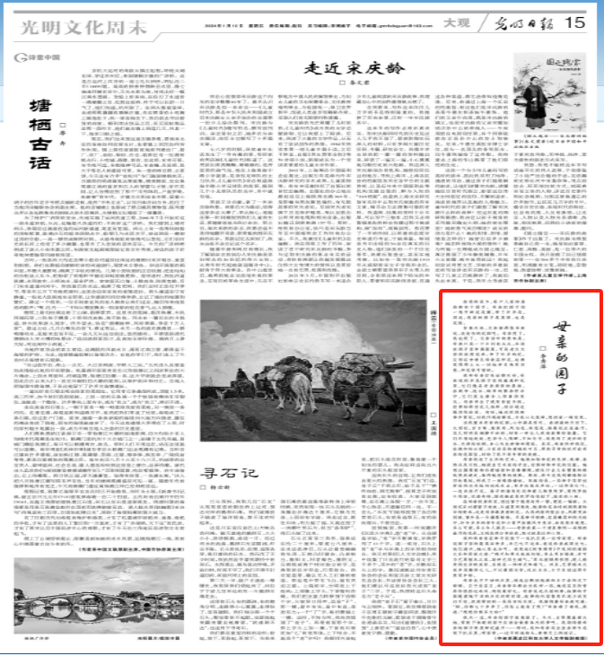 21/ 2024-03《光明日报》:母亲的园子近日,人文社会科学学院汉语言文学专业李秀萍老师撰写的文章“母亲的园子”在《光明日报》第15版发表(后附原文)。李秀萍,汉语言文学专业教师,副教授,中国现当代文学专业硕士,主讲中国现代文学史、文艺美学等课程。据悉,李秀萍老师自2020年以来,先后在《光明日报》发表“园子里的童年”“冬日闲食”“露天电影”“冬藏的日子”“老冰棍”“母亲的厨房”“母亲的园子”等文章,被各大媒体广泛转载,被部分省份纳入语文学...
