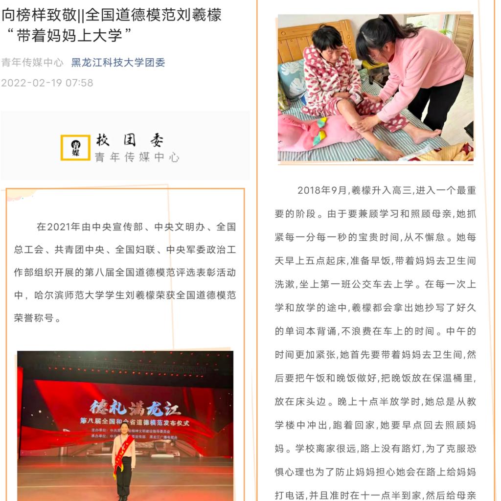 03/ 2022-03【官网】开展向第八届全国道德模范刘羲檬同学学习活动为广泛宣传道德模范的先进事迹,营造学习道德模范的浓厚氛围,弘扬中华传统美德,培育时代新风,按照省委教育工委《关于在全省大中小学生中开展向第八届全国道德模范刘羲檬同学学习的通知》工作安排,校团委近期在全校青年学生中组织开展了向第八届全国道德模范刘羲檬同学学习活动。刘羲檬是黑龙江省大庆市肇源县人,哈尔滨师范大学大三学生。由于母亲患有严重的类风湿瘫痪在床,这个“00后”女孩,十几年如一日照顾母亲,用她...