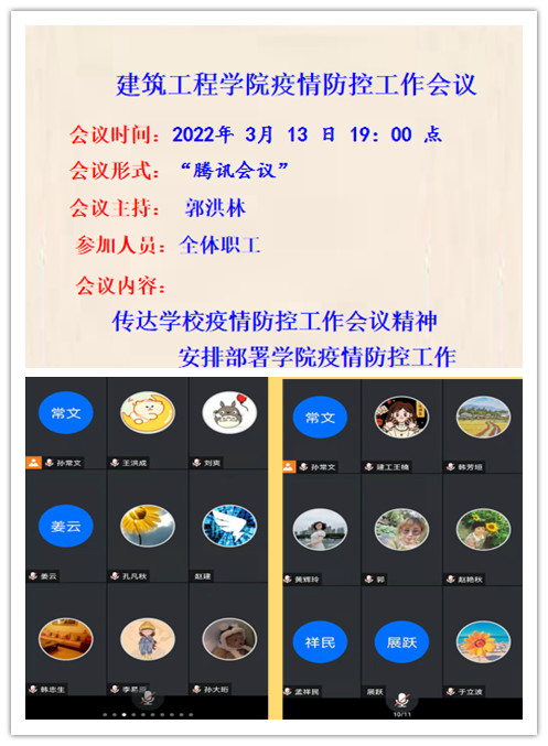15/ 2022-03【同心战“疫”】建筑工程学院迅速召开疫情防控工作会议为迅速落实学校疫情防控工作会议精神和要求,在扎实做好疫情防控工作的同时,确保各项工作推进,建筑工程学院于3月13日19:00时组织召开了全院职工线上会议,会议由学院党委书记郭洪林主持。会上,学院党委书记郭洪林传达了学校3月23日下午组织召开的疫情防控工作会议精神:一是自下周开始学院党政负责人安排一人住校,主持日常工作;二是有极特殊情况需入校的职工,必须严格履行入校审批手续;三是学校进行全封闭管理,暂定一...