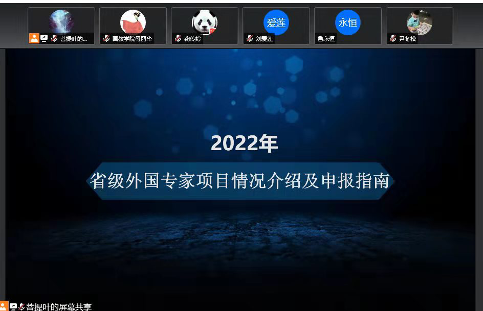11/ 2022-03【官网】召开2022年引进外国专家项目培训会为深入贯彻习近平总书记关于科技创新和引才引智工作的重要论述精神,践行“聚天下英才而用之”的战略思想,根据党的十九届五中全会对科技创新的总体部署。按照【官网】二次党代会的工作要求,建设高水平应用型大学,提升国际交流水平,培养学生的国际化视野。国际交流合作处近期召开了2022年引进外国专家项目线上培训会。国际交流合作处全体成员及拟申报的8个学院、18位学院领导和教师参加了本次培训会。会议由母丽华处长主持。母处...