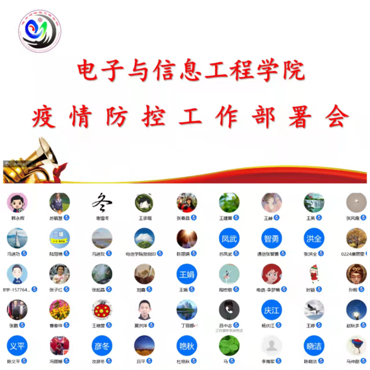17/ 2022-03【同心战“疫”】电子与信息工程学院召开疫情防控工作部署会议为贯彻落实学校疫情防控工作视频会议精神,做好学院疫情防控工作,3月16日晚,电信学院召开了全体教职工疫情防控工作视频会议。会议由学院党委书记贺启印主持。会上,院长杨庆江传达了3月16日学校疫情防控工作会议精神,安排部署了学院近期疫情防控工作,同时提出在疫情期间要做到教育教学管理到位、人员情况清到位、学院重点工作推进到位。各分管领导就近期具体工作作出了安排部署。最后,学院党委书记贺启印就如何抓好学院疫...