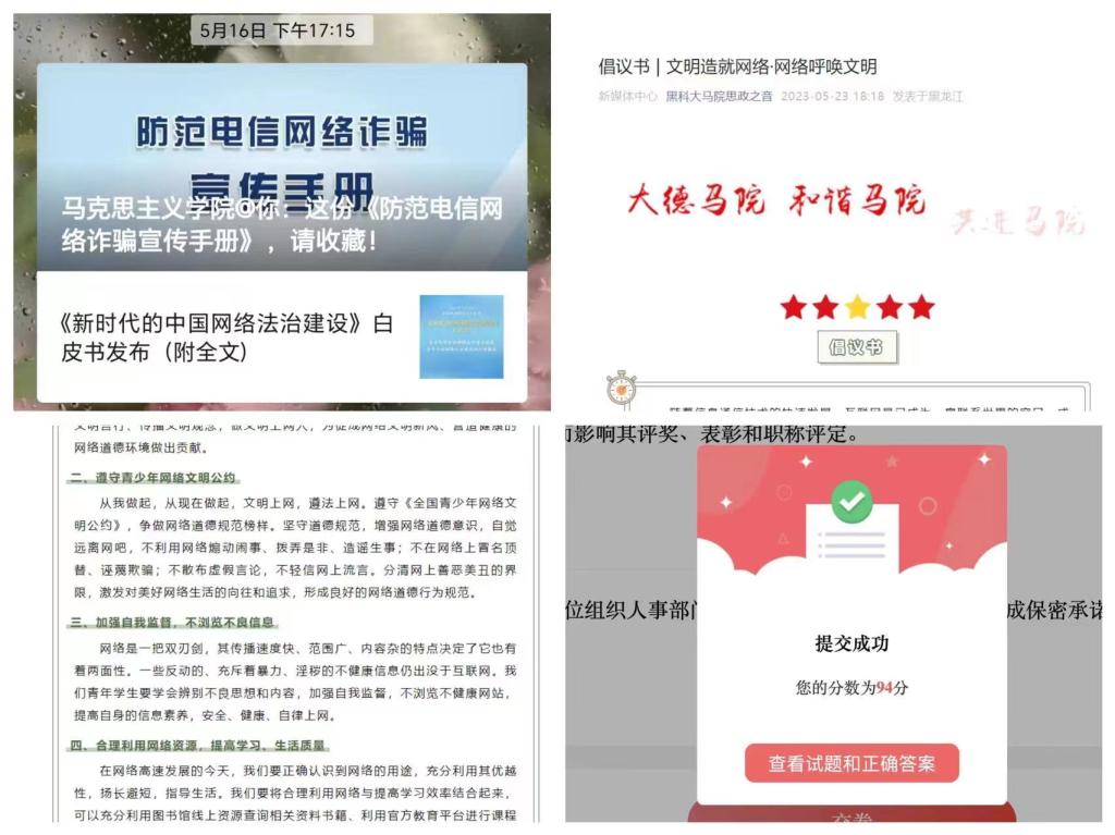 25/ 2023-05马克思主义学院开展“提升网络法治意识和素养”专题思想教育活动结合《关于在全校学生中开展“提升网络法治意识和素养”专题思想教育活动的实施方案》文件要求,为响应中央网信办“清朗”行动,深化网络法治建设,加强网络法治宣传教育,引导大学生养成良好的网络行为习惯,5月4日-5月25日,马克思主义学院在全体青年学生中开展“提升网络法治意识和素养”专题思想教育活动。丰富网络法治教育多样性,营造法治学习“新浪潮”。进一步强化使命担当,加大网络普法载体创新力度,营造学法、守法...