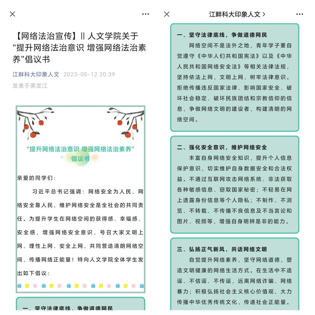 25/ 2023-05人文学院开展“提升网络法治意识,增强网络法治素养”系列活动为落实学生工作部下发的《关于在全校学生中开展“提升网络法治意识和素养”专题思想教育活动的实施方案》,加强网络法治宣传教育,增强学生的网络法治意识,引导大学生养成良好的网络行为习惯,进一步弘扬时代新风、共建网络文明,人文学院开展“提升网络法治意识,增强网络法治素养”系列活动。普法脚步不停歇,法治宣传在身边。开展网络法治宣传活动,组织学生学习《中华人民共和国网络安全法》、《新时代的中国网络法治建设...