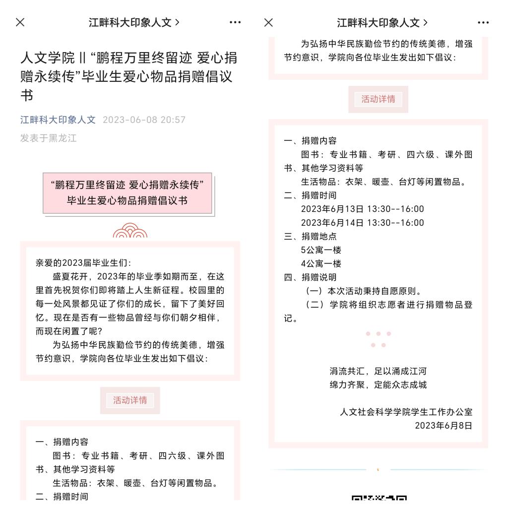 13/ 2023-06人文学院开展“季忆留夏 青春远航”2023届毕业生文明离校教育活动为营造文明有序、温馨难忘的离校氛围,做好2023届毕业生文明离校教育工作,人文学院精心组织开展了“季忆留夏 青春远航”毕业生文明离校教育活动。氤氲书香,情留OD在线满园。发布“鹏程万里终留迹 爱心捐赠永续传”毕业生爱心物品捐赠倡议书,号召毕业生将闲置的图书、生活物品等进行捐赠,弘扬中华民族勤俭节约的传统美德,传递爱心,续写青春故事。不负韶华,绽放青春色彩。开展“星梦研续共向未来”考研经验分享,“砥志研思 ...