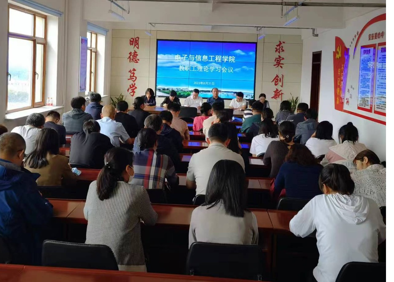 01/ 2023-09电子与信息工程学院召开教职工政治理论学习会议为深入学习贯彻习近平新时代中国特色社会主义思想,学习传达学校2023年暑期论坛暨秋季学期开会工作会议精神,8月31日下午1点20,电子与信息工程学院在朝阳楼0809会议室召开了教职工政治理论学习会议。会议由学院党委书记齐秀强主持。齐秀强领学了习近平总书记对党的建设和组织工作作出的重要指示精神、习近平总书记在中共中央政治局第六次集体学习时的讲话精神,为大家介绍了什么是“千万工程”及其做法和成效、经验启示,为大...