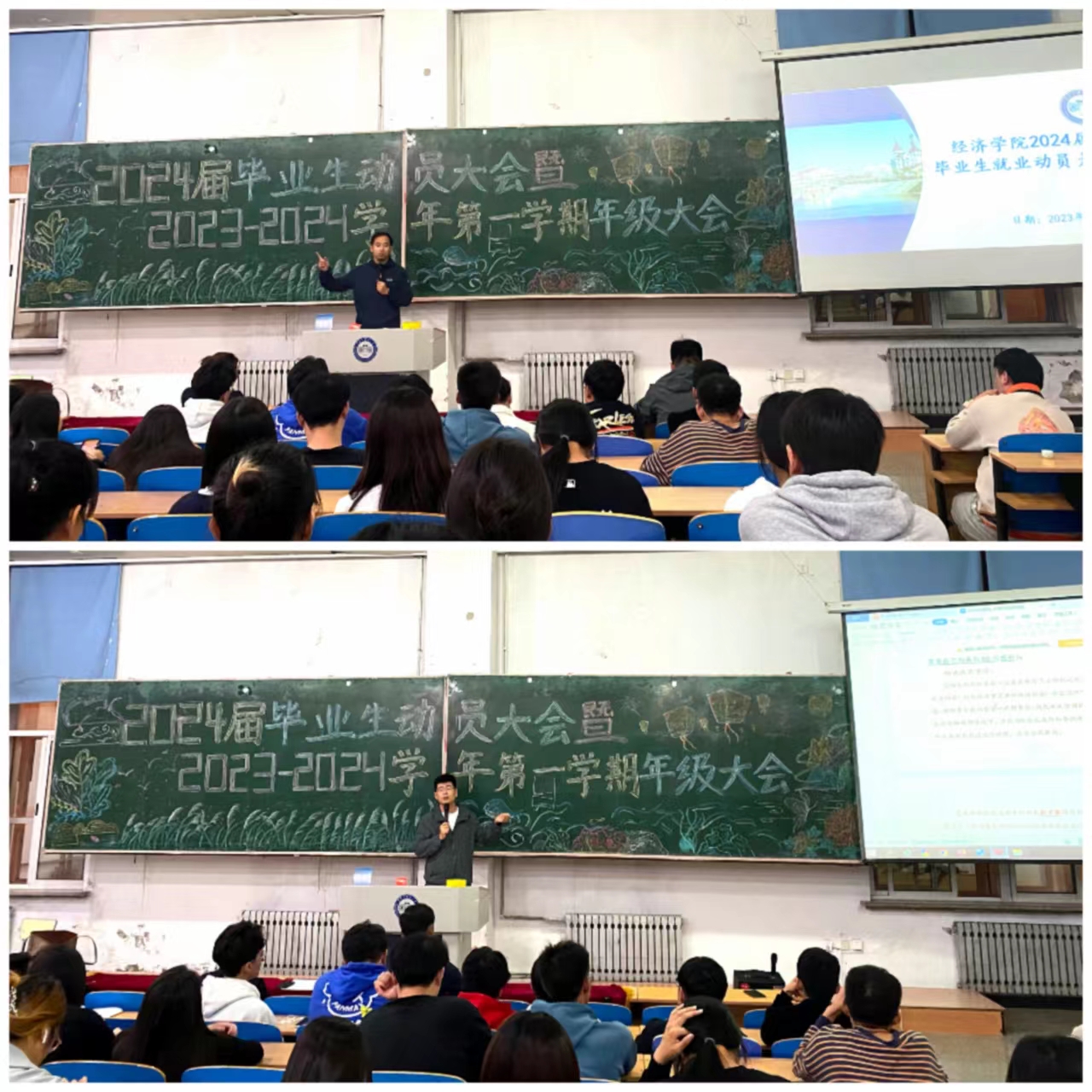 01/ 2023-09经济学院召开2024届毕业生就业动员大会为全面推进学院2024届毕业生就业工作,引导毕业生树立正确的就业观念,提高就业积极性和主动性,8月31日晚,经济学院在教学主楼EN0401召开2024届毕业生就业动员大会,学院党委副书记邬丽群、毕业年级辅导员、就业辅导员及2024届全体毕业生参加会议。会议由毕业年级辅导员陈美玲主持。会上,就业辅导员王东旭针对云就业系统操作、生源信息核对、网签流程进行了解释说明,并结合往年的实例指出了可能存在的问题及注意事项。经济学...