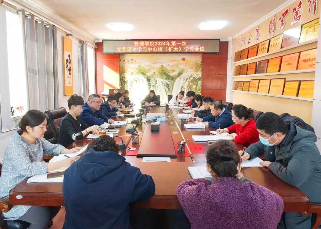 04/ 2024-03管理学院召开2024年第一次党委理论学习中心组(扩大)学习会议3月1日,管理学院在三楼会议室召开2024年第一次党委理论学习中心组(扩大)学习会议。会议集中传达学习了习近平总书记二〇二四年新年贺词、在中共中央国务院春节团拜会上的重要讲话精神、学校党委二届六次全体会议精神以及2024年教职工代表大会暨年度工作部署会议精神。学院党委书记何景洋主持集体学习并讲话。学院党委班子成员、教师党支部书记、系(部)中心主任和全体辅导员参加会议。会议指出,习近平总书记新年贺词和春节...