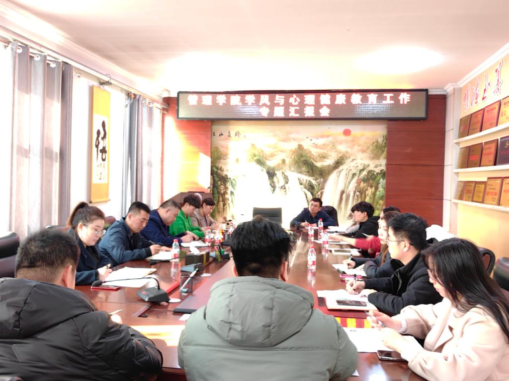 18/ 2024-03管理学院召开学风与心理健康教育工作专题汇报会为加强学院学风建设和心理健康教育工作,做好阶段性总结工作,凝心聚力推进学院学生工作高质量发展,3月15日下午,管理学院在学院三楼会议室召开学风与心理健康教育工作专题汇报会,学院党委书记何景洋、党委副书记徐海英、副院长高太光以及全体辅导员参加会议,会议由党委副书记徐海英主持。会上,学工办主任张茜传达了学生处工作例会近期重点工作安排;各年级辅导员结合工作实际对辖区学生基本情况、学风建设、心理健康、家访...