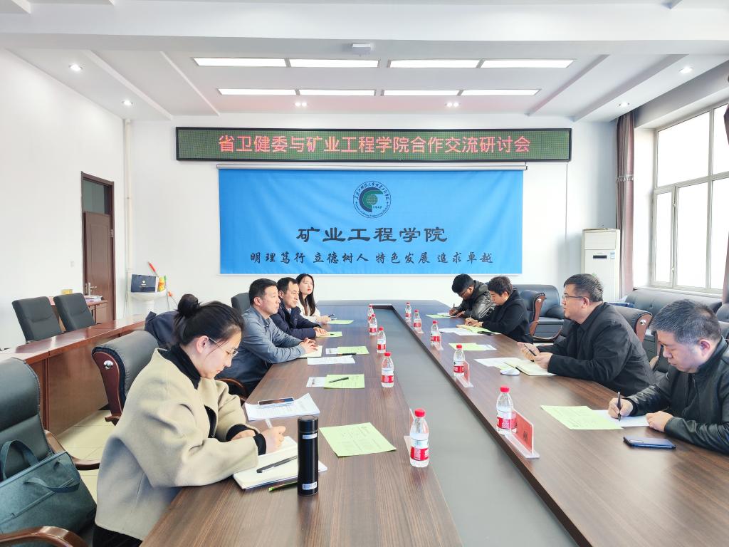 25/ 2024-03省卫健委职业健康处领导一行来矿业工程学院调研交流3月22日,省卫健委职业健康处处长关宝生、监察专员徐志东等一行4人到【官网】矿业工程学院进行调研交流。学院院长肖福坤、副院长康华、采矿系教师陈刚、董长吉参加了座谈会。会上,肖福坤对关宝生一行来访表示欢迎并简要介绍了学校、学院的基本情况,重点介绍了矿业工程实训中心在行业从业人员进行科普教育的开展情况,也介绍了学院针对煤炭企业开展的矿山灾害防治情况。他表示,一直以来,矿业学院全面贯彻党的教育方针,把健康教...