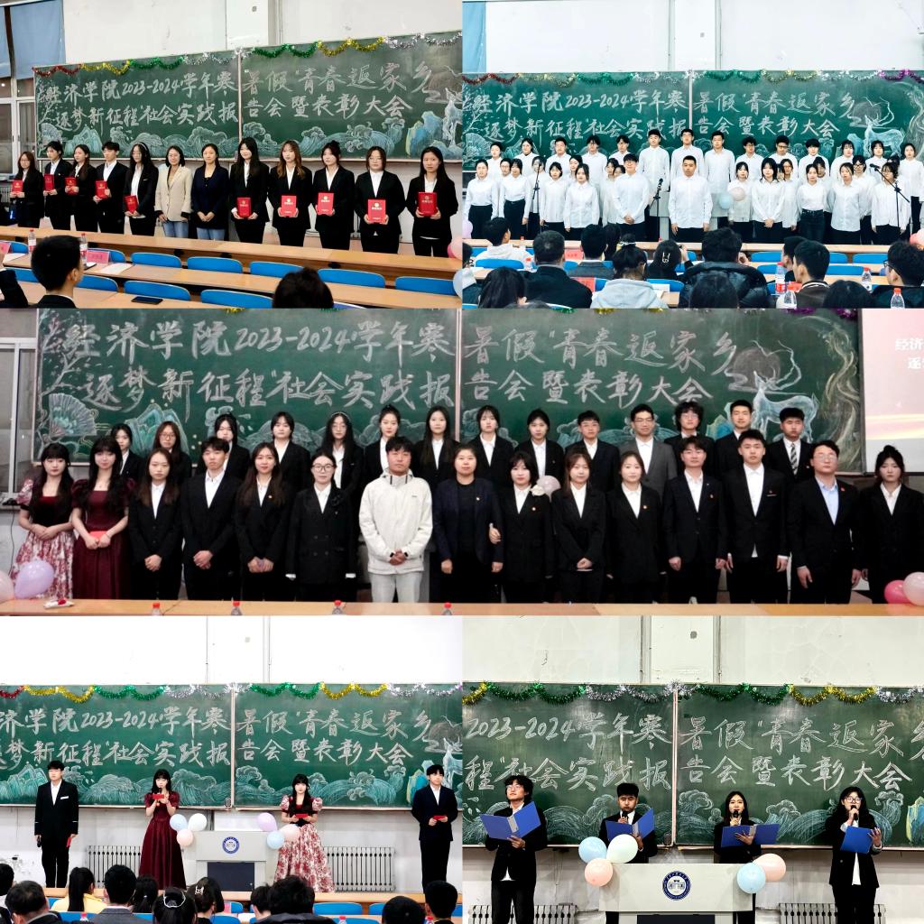 25/ 2024-03经济学院召开“青春返家乡,筑梦新征程”社会实践报告会暨表彰大会为表彰先进,树立榜样,展现经院学子优秀社会实践成果,经济学院于3月22日在主楼EN0401召开社会实践表彰大会,经济学院学工办主任陈美玲、团委书记姜胜馨、辅导员李笑晗及各学院团学骨干、经济学院2023级全体学生参加会议。表彰大会在雄壮的中国共青团团歌《光荣啊!中国共青团》声中拉开帷幕。首先,经济学院团委副书记、跨境电商实验21-1班范欣冉对本次寒假社会实践活动的总体情况进行汇报。主持人宣读《经济学院2023-2024学年...