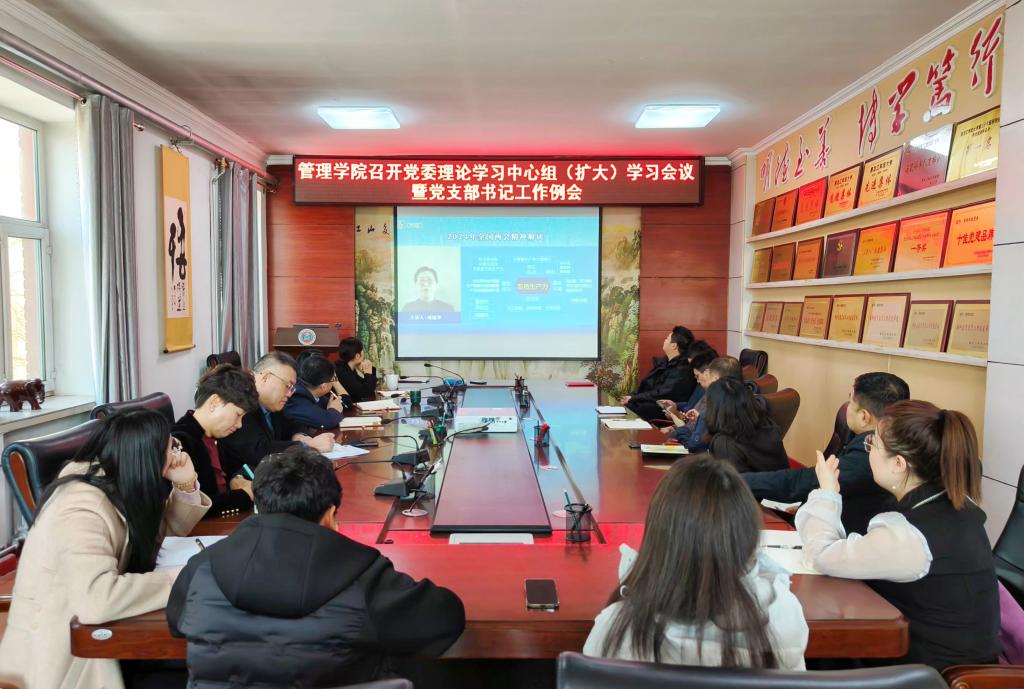 29/ 2024-03管理学院召开党委理论学习中心组(扩大)学习会议暨党支部书记工作例会按照学校党委统一部署,为深入学习贯彻2024年全国两会精神,3月25日,管理学院在三楼会议室召开党委理论学习中心组(扩大)学习会议暨党支部书记工作例会。学院党委班子成员、党支部书记及全体辅导员参加会议,会议由学院党委书记何景洋主持。会上,集中收看省委党校名师、二级教授刘瑞华所作《2024年全国两会精神解读》专题讲座。讲座中,刘教授以2024年全国两会主要议程为脉络,深入阐释了习近平总书记在全国两会期间重要讲话...