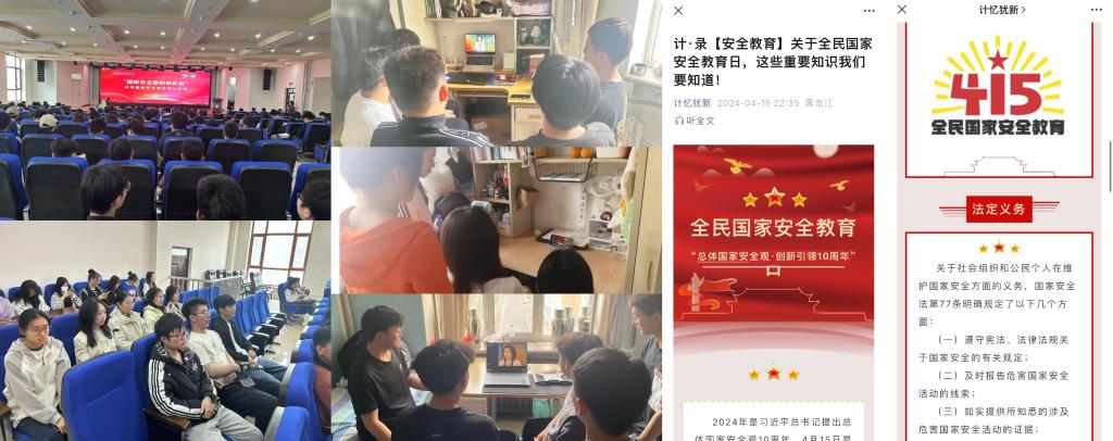 17/ 2024-04计算机与信息工程学院开展国家安全日主题教育活动为深入贯彻落实习近平总书记关于加强国家安全教育的重要指示精神,进一步推动总体国家安全观深入人心、落地生根,持续推进学院开展“永葆赤心 立德践行 勤学善思 笃行担当”主题思想教育活动,引导广大学生积极践行总体国家安全观,计算机学院于四月中旬开展“全民国家安全教育日”主题思想教育系列活动,通过集中讲座,媒体宣传,主题班会等多种形式,覆盖全院75个班级2211名学生,提高了我院全体师生的国家安全意识。4月15日...