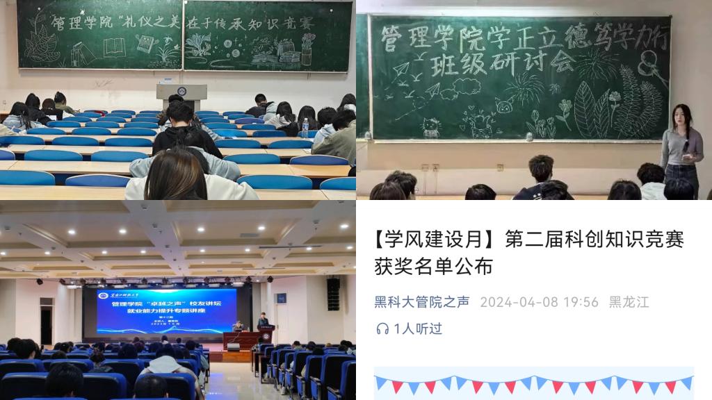 28/ 2024-04管理学院扎实开展“笃学奋进 培根铸魂”学风建设月系列活动为贯彻落实【官网】关于抓好学风建设工作的有关要求,着力强化学风建设整体性、协同性、主体性,激发学生学习的积极性和主动性,按照校团委下发的《2024年学风建设活动月实施方案》,一个月以来,管理学院认真谋划,积极组织,围绕“笃学奋进 培根铸魂”活动主题扎实开展学风建设月系列活动。以先进典型为引领,强化朋辈帮扶。学院相继开展“党员先锋行 朋辈共奋进”党建促学风主题活动、“榜样引领——国家奖学金颁奖仪式暨经验分...