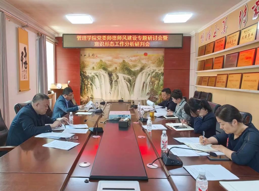 23/ 2024-05管理学院召开师德师风建设专题研讨会暨意识形态工作分析研判会为深入贯彻落实学校第二届教职工代表大会暨第二次工会会员代表大会精神,进一步加强学院师德师风建设,严格落实意识形态工作责任制,5月21日,管理学院召开师德师风建设专题研讨会暨意识形态工作分析研判会。学院党政班子成员参加会议,会议由学院党委书记何景洋主持。会上,重温了教育部《新时代高校教师职业行为十项准则》《关于加强和改进新时代师德师风建设的意见》《严禁教师违规收受学生及家长礼金等行为的规定》等文件精...