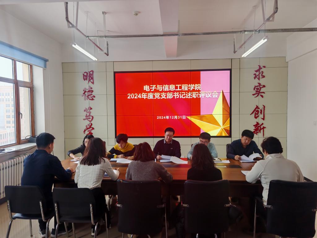 31/ 2024-12电子与信息工程学院召开党支部书记例会暨2024年度党支部书记抓基层党建工作述职评议会议为深入贯彻落实习近平总书记关于党的建设的重要思想和第二十八次全国高校党的建设工作会议精神,总结和交流一年来学院各党支部书记抓基层党建工作的成绩和经验,进一步强化和明确党支部书记“第一责任人”职责,12月31日上午,电子与信息工程学院党委在朝阳楼0809会议室召开了学院党支部书记例会暨2024年度党支部书记抓基层党建工作述职评议会议。学院党委委员、各党支部书记参加会议,会议由学院党委书记齐秀强主持。会上,学院各党支部书记围绕一年来的履职情况、巩固党纪学习教育成果、党员队伍建设、支...