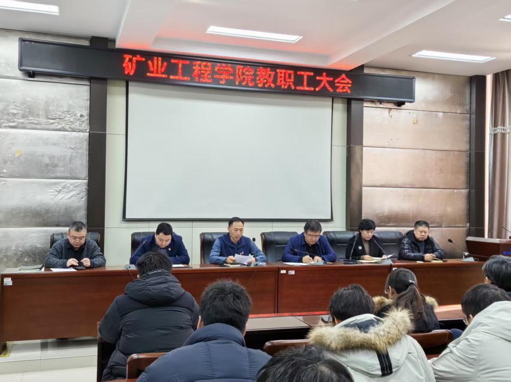 28/ 2025-02矿业工程学院召开新学期教职工大会2月27日上午,矿业工程学院召开新学期全院教职工大会,学院领导班子成员及全体教职工参加会议。会议由学院党委副书记李强主持。学院党委书记赵喜江重点领学和解读了校党委书记周宏力在学校党委二届八次全体会议上作的题为《坚定信心乘势而上加力推进学校事业建设发展再创新佳绩》工作报告、校长工作报告和纪委工作报告,并对全面从严治党、师德师风、教风学风等工作进行了部署强调。他指出,2025年是“十四五”规划收官之年、“...