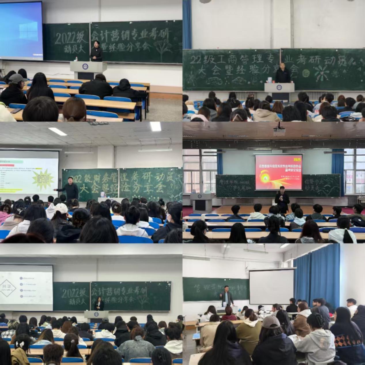 25/ 2025-04管理学院召开 2022 级本科生考研动员大会为深入贯彻落实习近平总书记关于教育的重要论述和全国教育大会精神,进一步弘扬“尊师、守纪、勤奋、进取”优良学风,加强学院学风建设,全面调动2022级学生的考研积极性,管理学院于4月24日分专业召开2022级学生考研动员大会,各专业教师、年级辅导员、21级成功考取研究生代表以及全体22级学生参会。会上,年级辅导员从考研的意义、考研的趋势以及考研对个人价值提升三个方面简要阐述,通过分析具体数据展示学院近年来的考研报名人数、录取人数以及报考院校分布等情况。各专业教师从专业视角剖析行业现...