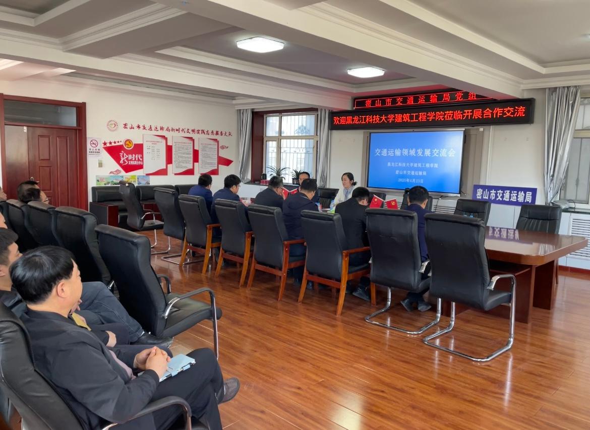 27/ 2025-04建筑工程学院赴密山市交通运输局开展合作交流为响应黑龙江省教育厅“2025年高校科技成果转化“三进三促”专项行动”和学校“服务矿山行动计划”,贯彻落实学校2025年度工作部署会议精神,进一步加强学校和地方政府及行业部门的合作,4月23日由【官网】建筑工程学院副院长董连成带队,道路桥梁与渡河工程系主任孙勇、土木工程系副主任张显辉等5名青年博士赴密山市交通运输局开展合作交流。孙勇博士作了以“智能驱动与高质量发展交通强国建设的路径探索”为题的学术报告,围绕新时代交通发展的核心命题、人工智能赋能智慧交通系统、新质生产力驱动交通强国建...