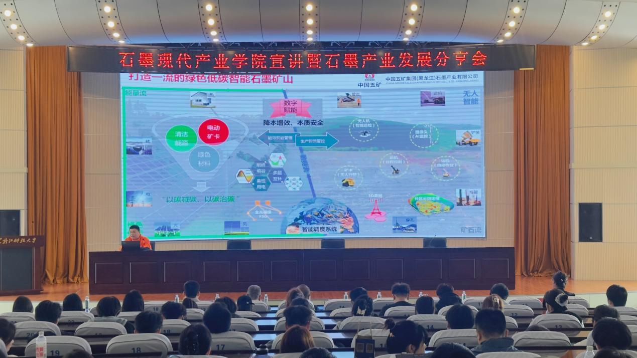 26/ 2025-05校企联动育英才 产教融合助"双碳" ——石墨现代产业学院举办2025年度招生宣讲暨产业分享会5月21日,石墨现代产业学院联合中国五矿集团(黑龙江)石墨有限公司在信息楼报告厅成功举办石墨现代产业学院招生宣讲暨产业分享会。五矿集团人力资源部经理王超、冯凯等石墨现代产业学院合作企业代表与来自材料学院、环化学院、矿业学院、理学院的200余名师生共聚一堂,共话石墨产业人才培养新路径。校长助理姚君教授、石墨研究院首席专家张海军及材料学院相关领导与教师参加宣讲会,会议由材料学院副院长吴岩主持。会上中国五矿集团王超经理立足“双碳”战略背景,系统剖析全球石墨产业发展格局,作为行业领军企...