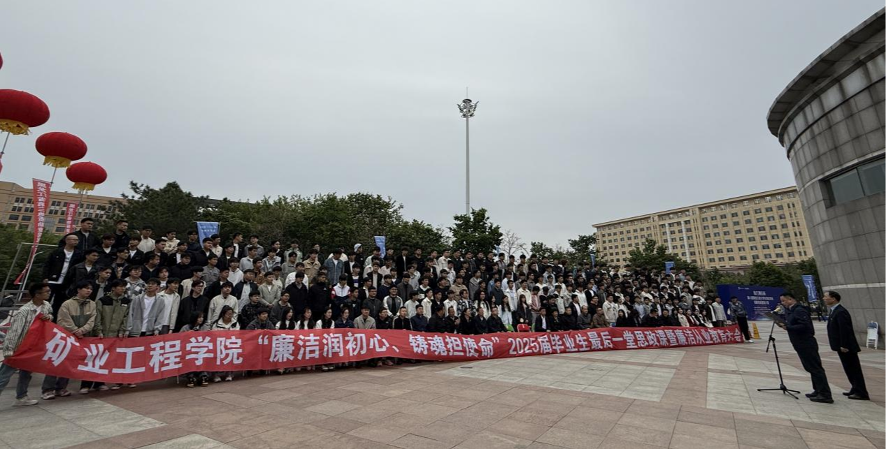 21/ 2025-05矿业工程学院召开“廉洁润初心、铸魂担使命” 2025届毕业生最后一堂思政课暨廉洁从业教育大会5月16日,矿业工程学院召开“廉洁润初心、铸魂担使命”2025届毕业生最后一堂思政课暨廉洁从业教育大会。学院党政领导班子、各系主任、毕业班班主任、全体辅导员及2025届全体毕业生参加大会,会议由学院党委副书记李强主持。龙勘查21-1班王金艺同学作为毕业生代表,宣读《毕业生文明离校、廉洁从业倡议书》,呼吁全体毕业生牢记初心使命,秉持职业道德,坚守廉洁底线,以文明姿态完成学业、步入工作岗位。学院党委书记赵喜江为2025届毕业生讲授最后一堂廉洁教育专题思政课,他对全体毕业生提出了“胸...