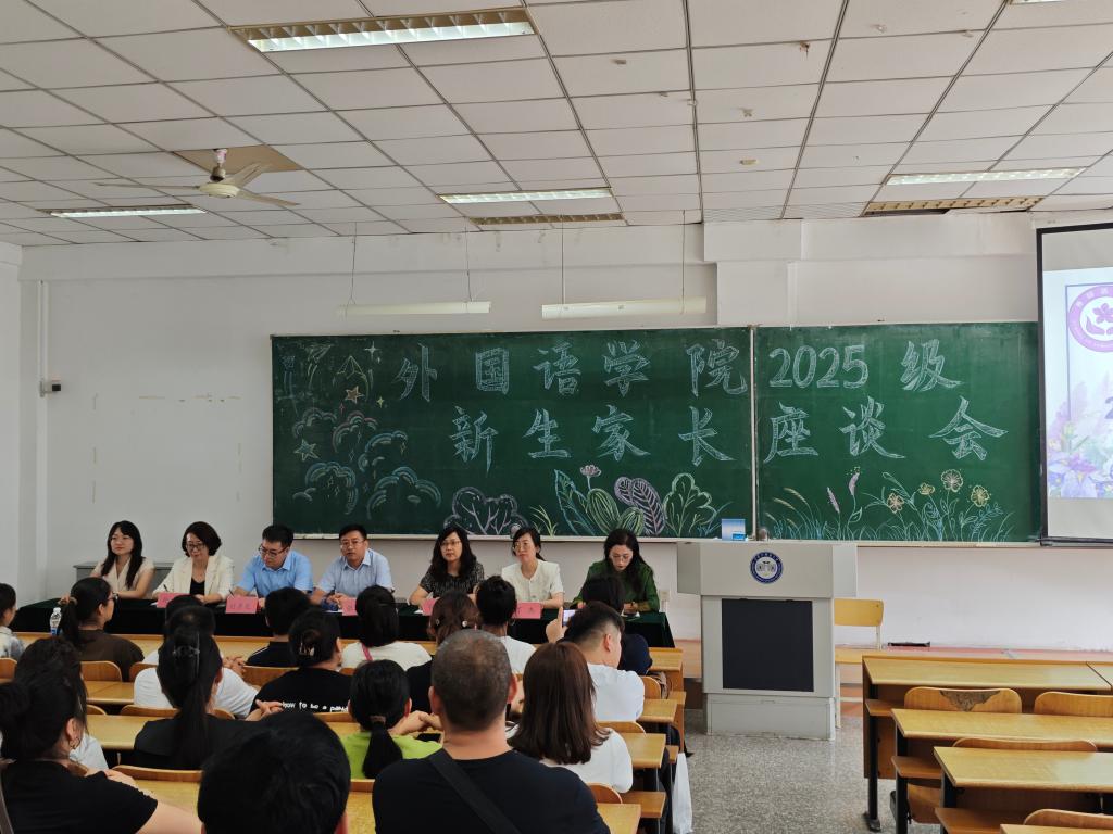 31/ 2025-08外国语学院召开2025级新生家长座谈会为搭建家校沟通桥梁、凝聚育人合力,8月29日下午,外国语学院在科厦N108召开2025级新生家长座谈会。学院领导、系主任、辅导员及50余名新生家长参会,会议由学院党委书记张海涛主持。会上,党委书记张海涛代表学院向家长的到来表示热烈欢迎、向同学们考入理想大学致以诚挚的祝贺,介绍了学校办学历程、办学特色、办学精神和办学理念。院长程雪连围绕学院发展建设核心,从学科发展规划、高水平师资队伍构建、特色专业建设及人才培养体系创新等方面进行了详细介绍。她强调,学院始终以培养“思想道德素质高、...
