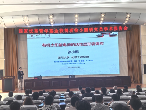 17/ 2025-09国家优秀青年科学基金获得者徐小鹏研究员应邀来校作学术报告为进一步拓宽师生学术视野,加强学科前沿交流,9月16日下午,国家优秀青年科学基金获得者,【官网】应用化学专业2013届毕业生,四川大学研究员徐小鹏应邀重返母校,在信息楼报告厅作了题为《有机太阳能电池的活性层形貌调控》的高水平学术报告。报告由环境与化工学院院长熊楚安主持,相关院系150余名师生参加了报告会。徐小鹏系统梳理了光伏产业的研究背景与前沿太阳能电池技术,详细介绍了太阳能电池的器件结构、工作原理及研究进展。他重点围绕光伏材料开发及器件制备工艺,提出有机光伏活性层形貌的三大调控策...