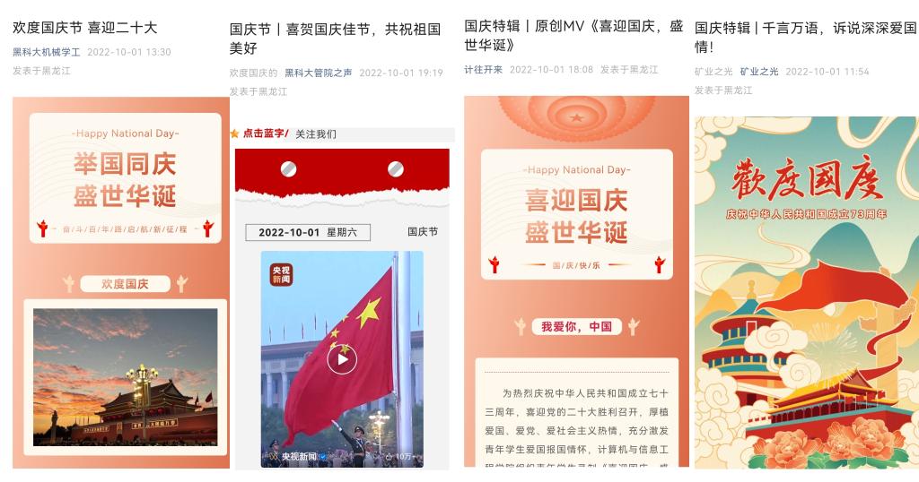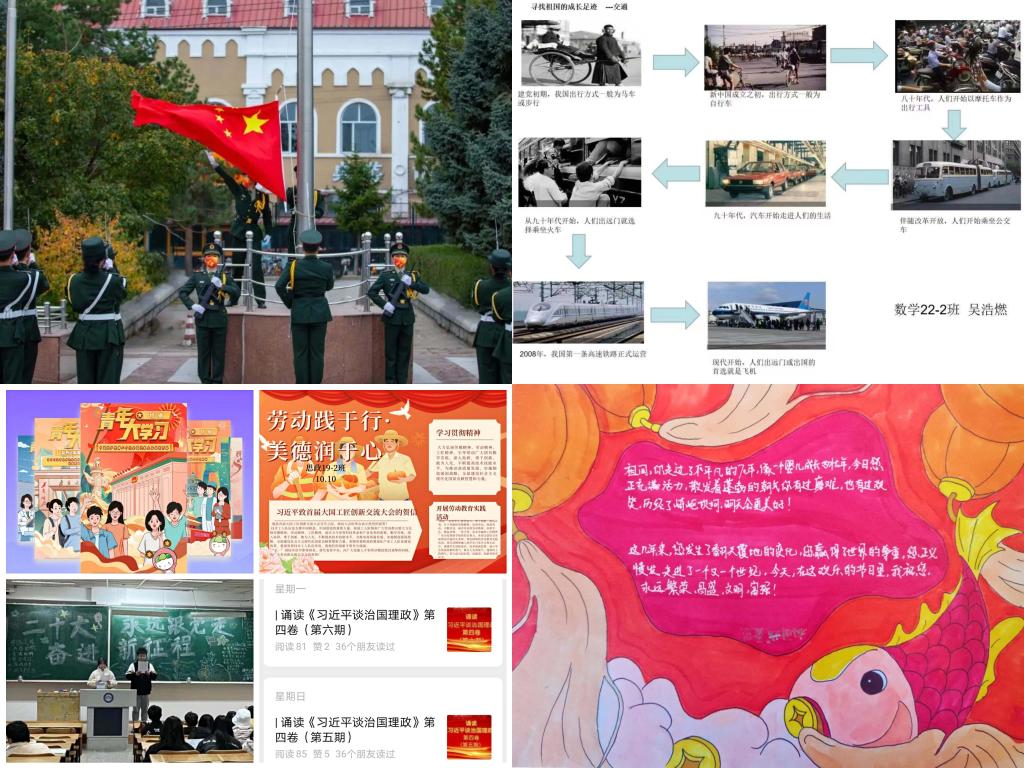 突出仪式感召氛围,做敢担当的新时代好青年。国庆节当天,【官网】举行了“喜迎二十大 永远跟党走 奋进新征程”主题升旗仪式,通过开展国旗下的演讲、齐唱国歌、重温入团誓词、匍匐刀表演等形式表达了对党和祖国的热爱与祝福,在实践中坚定青年责任和使命担当,为实现民族复兴接力奋斗。全校各团支部通过线上线下相结合方式广泛开展“学习二十大 永远跟党走 奋进新征程”主题团日活动,丰富了团活内容、创新了团活形式,教育引导【官网】团员青年坚定理想信念、弘扬爱国精神。电气学院团委开展了“永远跟党走 启航新征程”主题信封活动,通过时光信封活动,许下青春期许,让青年学子明确目标,种下希望,收获成功。安全学院团委开展了“筑梦灯火万家 庆我盛世中华”活动,将一颗颗爱国之心、一片片爱国之情用国旗高挂房梁的形式展现,抒发对祖国母亲的美好祝愿。理学院团委开展了“寻找祖国的成长足迹”活动,以重要的历史事件、科技成就为逻辑主线进行梳理、搜集、整理图文资料,让学生们深刻感受到中华民族从站起来、富起来到强起来的伟大飞跃,感受到祖国经济社会发展的辉煌成就。马克思学院团委开展诵读《习近平谈治国理政》(第四卷)活动,教育广大青年学生深刻领会和把握讲话的重大意义,引导青年学生感受党的伟大、人民的伟大、祖国的伟大。