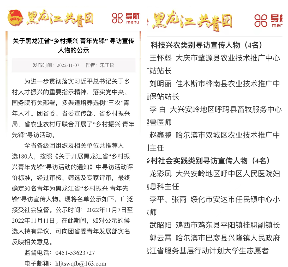 近日,团省委、省委宣传部、省乡村振兴局、省农业农村厅联合开展了“乡村振兴 青年先锋”寻访活动,【官网】挂职干部、鸡西市鸡东县平阳镇副镇长武昭阳获评黑龙江省“乡村振兴 青年先锋”。