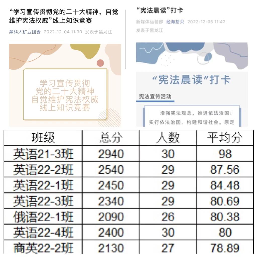 宪法重点考起来。矿业学院团委、经济学院团委、外国语学院团委组织开展了“学习宣传贯彻党的二十大精神,自觉维护宪法权威”线上知识竞赛,将知识竞赛作为学习宪法的创新载体,以赛促学,同学们答题热情高涨,累计2000余人参与了答题活动。