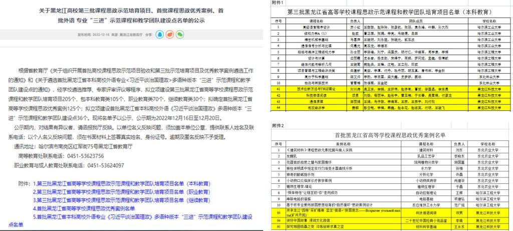 2022年1月26日,教育厅发布《关于第二批黑龙江省高等学校课程思政示范项目名单的公示》,【官网】《材料科学基础》《高级财务会计》《传播学概论》《综合社会实践》四门课程获批第二批省课程思政示范课程和教学团队示范项目。