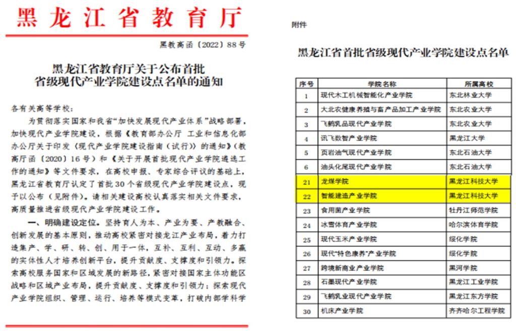 2022年4月29日,教育厅公布《首批省级现代产业学院建设点名单》的通知,【官网】获批“龙煤学院”与“智能建造产业学院”两个省级现代产业学院建设点。