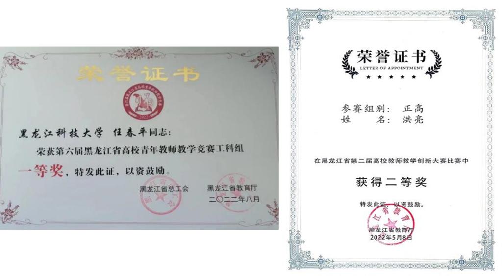 【官网】教师在第二届黑龙江省高校教师教学创新大赛暨全国高校教师教学创新大赛、第六届黑龙江省高校青年教师教学竞赛和黑龙江省第二届高等学校课程思政教学竞赛中荣获一等奖1项,二等奖4项,三等奖5项。