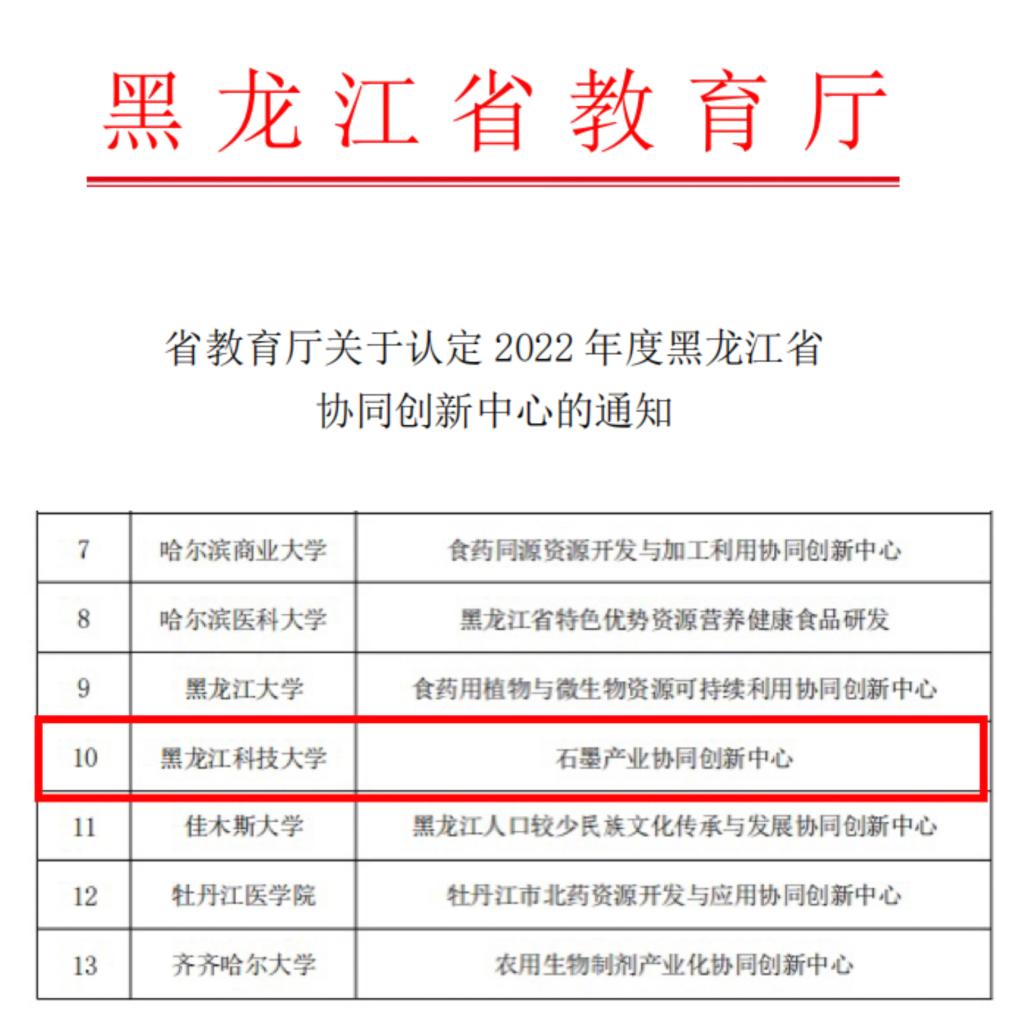 日前,黑龙江省教育厅下发《关于认定2022年度黑龙江省协同创新中心的通知》,新认定13个省级协同创新中心,【官网】牵头建设的“石墨产业协同创新中心”成功获批。