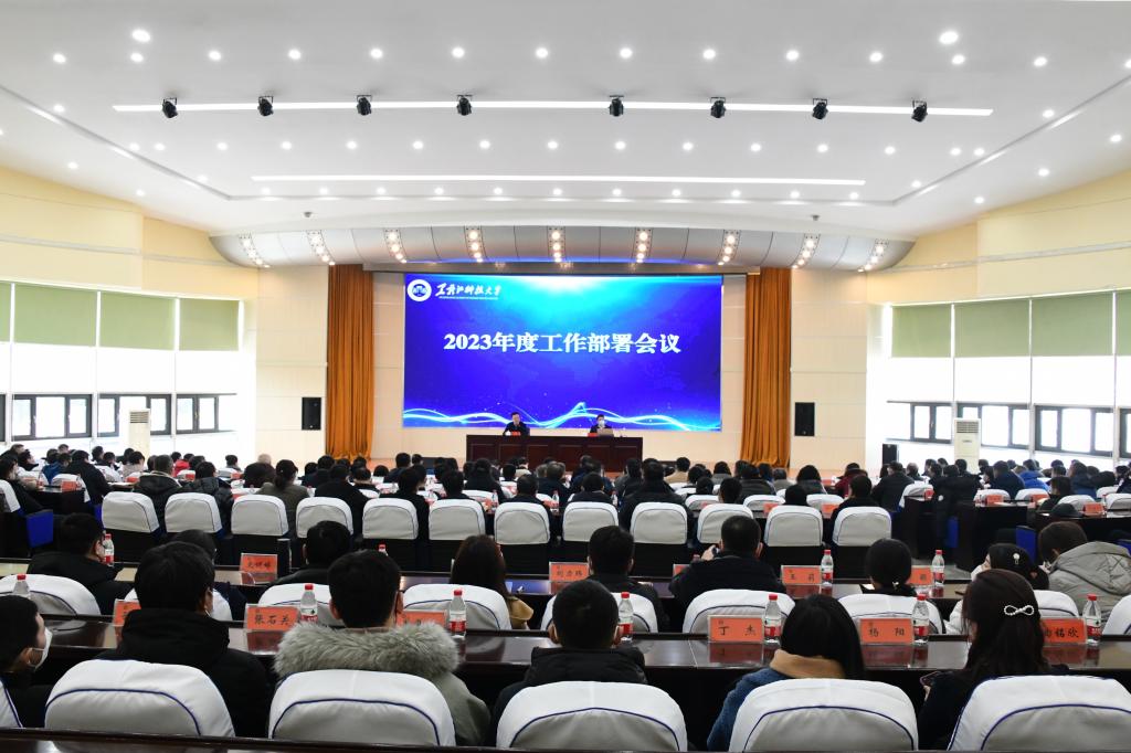 孟上九回顾总结了2022年度主要工作并对本年度学校重点工作进行了安排部署。一是以科学谋篇布局为统领,让学校内部治理更具效能。扎实推进学校“十四五”规划实施;完善以章程为统领的制度体系;深化新时代教育评价改革。二是以建成省特色应用型本科示范高校为牵引,人才培养模式更具OD在线特色。高质量建成省特色应用型本科示范高校;完善应用型人才培养模式,深化科教融合、学科融合、产教融合及专创融合。三是以成功获批博士学位授予单位为引领,让学校内涵建设更上水平。全力争取获批博士学位授予单位;推进特色学科建设;推进“新一轮本科教育教学审核评估”工作;推进专业内涵建设。四是以推进学生全面发展为重点,让人才培养更有质量。提升学生教育管理服务水平;提升研究生培养水平;提升招生就业工作水平;提升创新创业工作水平;提升开放办学水平。五是以提高科研水平和服务能力为抓手,在助力龙江振兴发展中更显担当。聚焦提升科研攻关能力;聚焦高层次科研平台建设;聚焦提高社会服务贡献度。六是以建设高水平师资队伍为引领,让人才队伍更具实力。加强引才聚才工作;加强人才培育工作;加强激励机制建设。七是以持续改善民生为导向,让师生更有幸福感。坚持“以人民为中心”的发展思想,通过加强财务与审计监督管理,加强国有资产管理,加强基础建设和后勤服务保障,加强民生改善工作,加强“平安校园”建设积极改善办学条件,持续办好民生实事,努力提升师生幸福感、获得感、安全感,着力打造和谐平安校园。