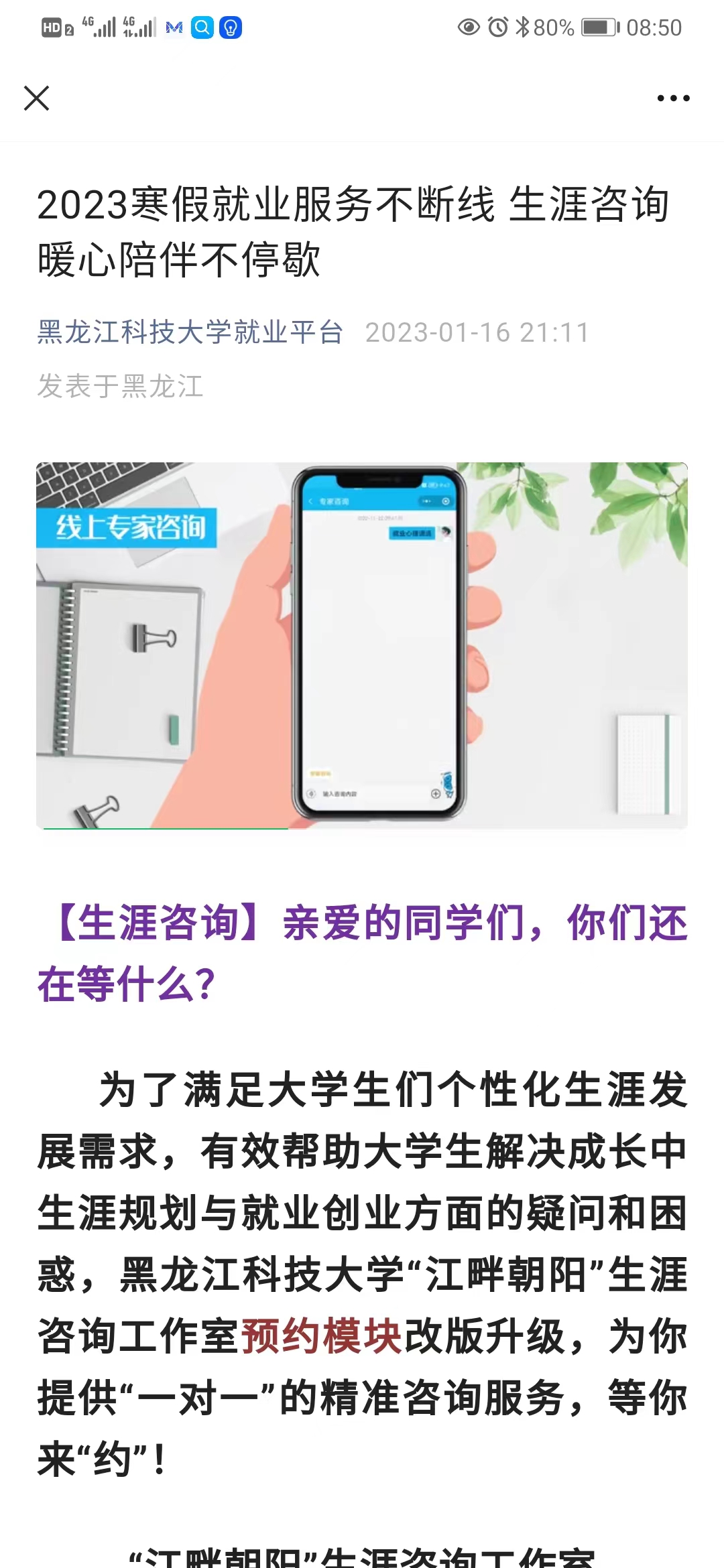 强化指导,暖心服务。为了满足大学生们个性化生涯发展需求,有效帮助大学生解决成长中生涯规划与就业创业方面的疑问和困惑,OD在线“江畔朝阳”生涯咨询工作室依托“云就业平台”进行了线上咨询的全面升级改造,在“OD在线就业平台”公众号上安排专业教师在寒假期间开展线上咨询,为学生提供“一对一”的生涯规划与就业指导个体咨询服务,在生涯咨询、简历修改、面试技巧、政策咨询、手续流程咨询、就业心理疏导、职业生涯测评等方面帮助学生探求答案,指引方向。