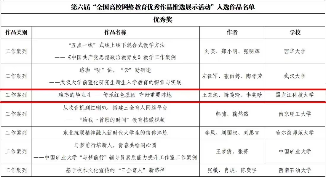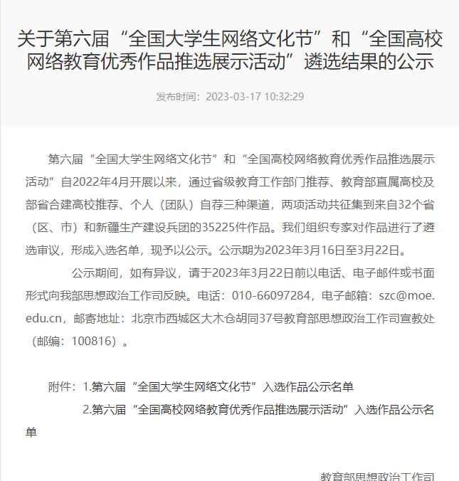 “全国高校网络教育优秀作品推选展示活动”由教育部思想政治工作司、中央网信办网络社会工作局主办,是全国网络思政教育领域具有权威性的活动之一。一直以来,【官网】以“网络文化节”为依托,引导广大师生积极参与网络产品创作生产,不断创新网络文化产品内容、形式,丰富载体,推出了一批思想精深、艺术精湛、制作精良的优秀网络文化作品。未来,校团委将充分发挥入选作品的示范作用,持续完善网络育人长效机制,努力开创新时代网络育人工作的新局面。