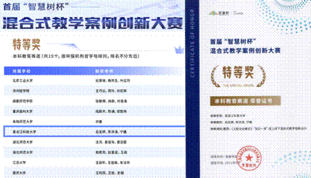 2022年9月至12月智慧树平台举办首届“智慧树杯”混合式教学案例创新大赛,来自同济大学、南开大学、山东大学等全国300余所高校500余门课程参与角逐,【官网】创新创业学院(工程训练中心)白玉婷、李洪涛和宁姗团队报送的《工程文化概论》混合式教学案例获得本科教育赛道最高奖——特等奖。
