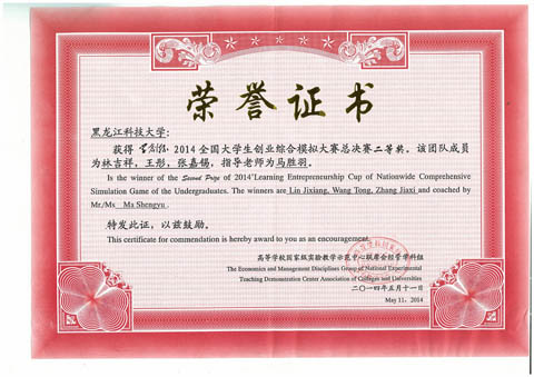 5月7日-14日【官网】人文学院教师马胜羽带队赴重庆参加全国“学创杯”2014全国大学生创业综合模拟大赛总决赛,经过创业之星模拟竞赛和创业计划书评审,最终【官网】代表队喜获国家二等奖。