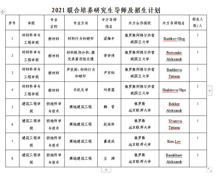材料科学与工程学院及建筑工程学院8位导师将分别与俄罗斯阿穆尔共青城国立大学、俄罗斯远东联邦大学国外8位导师联合培养硕士研究生。该项目为【官网】增加8名研究生招生计划,并纳入2021年度总规模。这是【官网】首次开展国际联合培养硕士研究生,学校研究生教育国际化取得新突破。