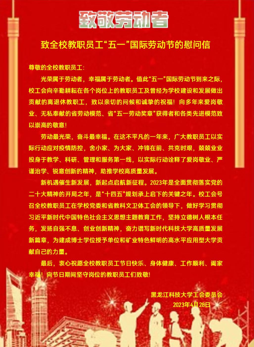 光荣属于劳动者,幸福属于劳动者。值此“五一”国际劳动节到来之际,校工会向辛勤耕耘在各个岗位上的教职员工及曾经为学校建设和发展做出贡献的离退休教职工,致以亲切的问候和诚挚的祝福!向多年来爱岗敬业、无私奉献的省劳动模范、省“五一劳动奖章”获得者和各类先进模范致以崇高的敬意!