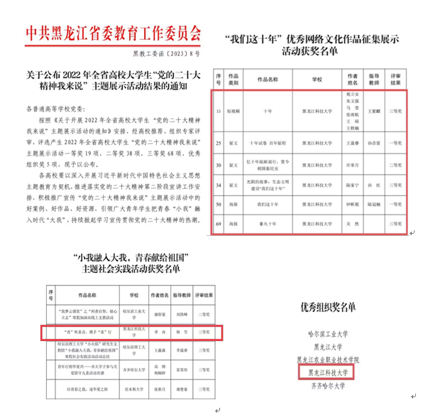 近日,由省教育工委举办的2022年全省高校大学生“党的二十大 精神我来说”主题展示活动结果揭晓,经高校初评、推荐,省委教育工委组织专家评审,【官网】荣获一等奖2项、二等奖1项、三等奖4项等荣誉,【官网】荣获优秀组织奖。