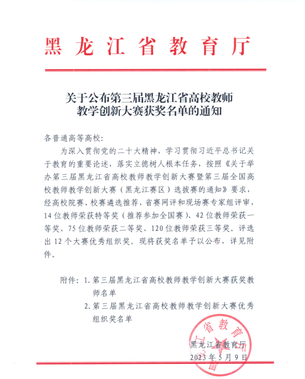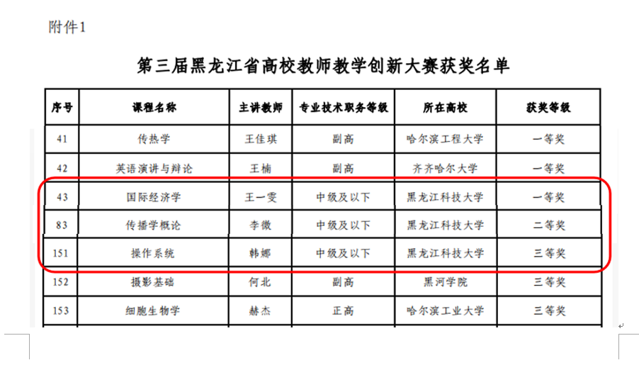 近日,由黑龙江省教育厅主办、哈尔滨医OD在线学承办的第三届黑龙江省高校教师教学创新大赛暨全国高校教师教学创新大赛(黑龙江赛区)选拔赛落下帷幕。【官网】经济学院王一雯教师团队荣获新文科组一等奖,人文学院李微教师团队荣获课程思政组二等奖,计算机学院韩娜教师团队荣获新工科组三等奖。【官网】获得大赛优秀组织奖。