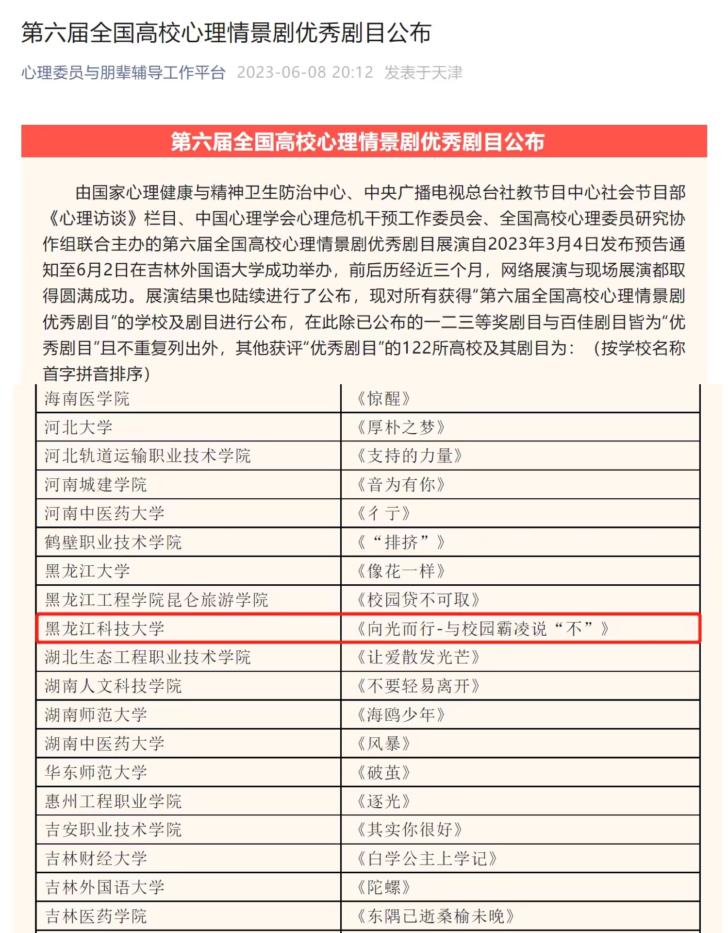 6月8日,由国家心理健康与精神卫生防治中心、中央广播电视总台社教节目中心社会节目部《心理访谈》栏目、中国心理学会心理危机干预工作委员会、全国高校心理委员研究协作组联合主办的第六届全国高校心理情景剧优秀剧目的展演活动圆满落幕,【官网】原创剧目《向光而行-与校园霸凌说“不”》以出色的表现入选全国高校心理情景剧“优秀剧目”,这也是【官网】心理情景剧首次获得此项全国赛事的荣誉。