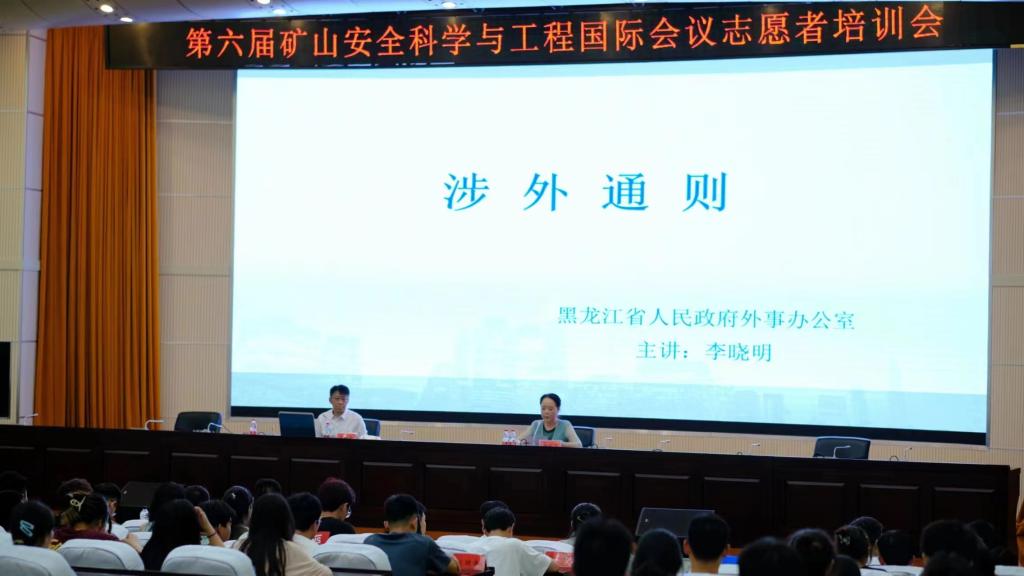 为全面深化能力作风建设“工作落实年”活动,紧紧围绕学校重点工作任务,高质量的完成第六届矿山安全科学与工程国际会议外事接待等工作任务,6月26日【官网】邀请黑龙江省人民政府外事办公室出国(境)管理处处长、省干部教育网络学院外事课程讲师李晓明在办公楼报告厅作题为“外事通则与涉外礼仪”的专题培训。由校团委、安全工程学院、矿业工程学院、外国语学院、研究生学院遴选的一百五十余名志愿者参加了培训,会议由国际交流合作处处长母丽华主持。