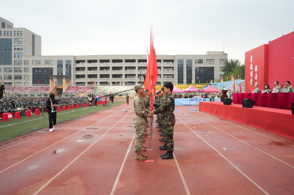 授旗仪式上校党委副书记桑玉军向军训旅授旅旗。军训旅副参谋长王晓凯主持了授连旗仪式。