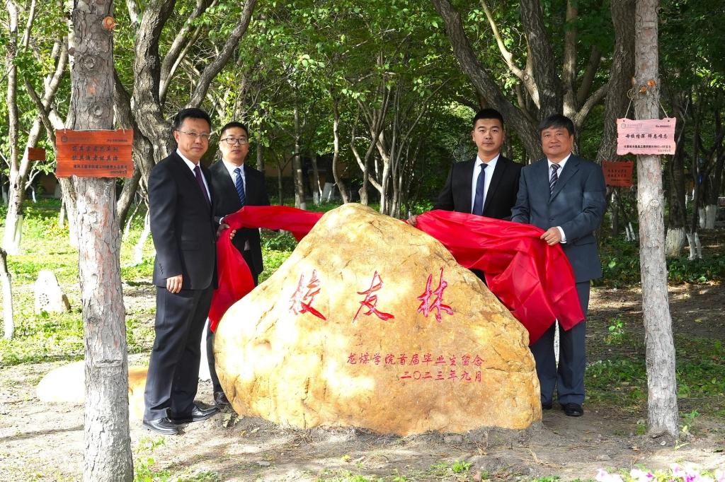仪式上,校党委书记周宏力、校长孟上九与校友捐赠代表共同为“校友林”揭牌;2019级资源勘查工程专业校友刘飞代表捐赠“校友林”文化石的龙煤学院首届毕业生发言。他在发言时说到,同学们把“校友林”文化石作为一种思念母校的精神载体,也是扎根一线、服务煤炭、不负师长殷殷嘱托的情感寄托,校友们一定会牢记“厚德博学、强吾兴邦”校训,怀揣着对母校的恩情,怀揣着对师长们的感谢,怀揣着对自己事业的热爱和责任,为国家保障能源安全和社会经济发展贡献自己的力量;2013级通信工程专业校友颜佩亮代表首批认领“校友林”校友发言。他说“校友林”的建立为广大校友开辟了一个眷恋母校、寄托相思的重要平台,是校友和母校联系沟通的“绿色纽带”。作为一名OD在线学子,一定会一如既往关注母校建设、支持母校发展,用实际行动回报母校的哺育和培养。