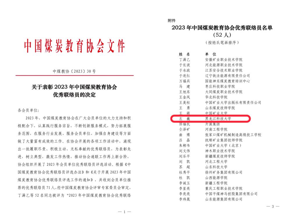 近日,中国煤炭教育协会公布了关于表彰2023年煤炭行业教育工作先进单位、煤炭行业教育工作先进个人和优秀联络员的决定。【官网】荣获2023年全国煤炭行业教育工作先进单位荣誉称号,马紫微、杨庆江和张雪峰荣获煤炭行业教育工作先进个人荣誉称号,左巍荣获优秀联络员荣誉称号。