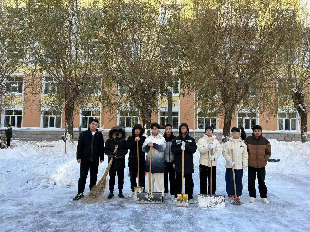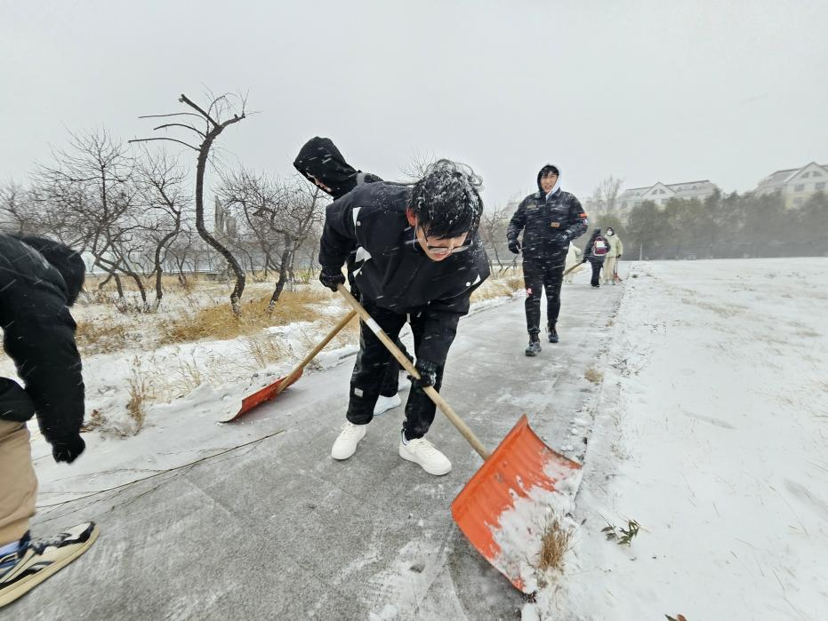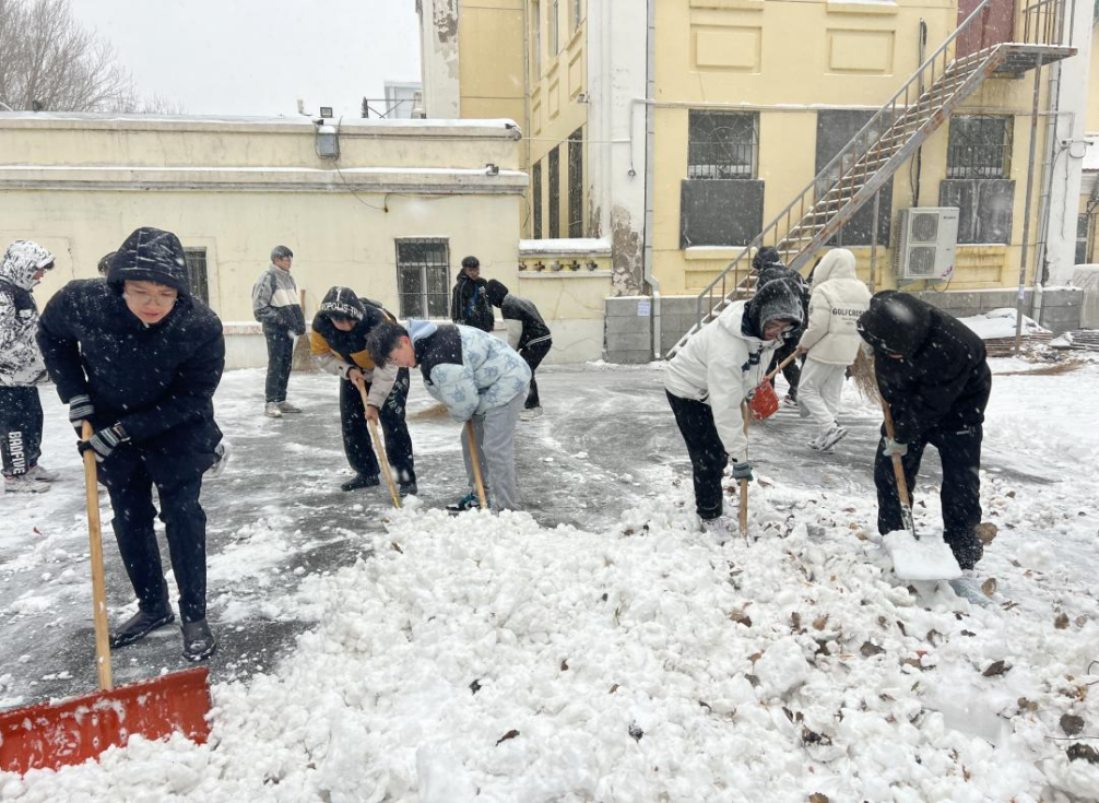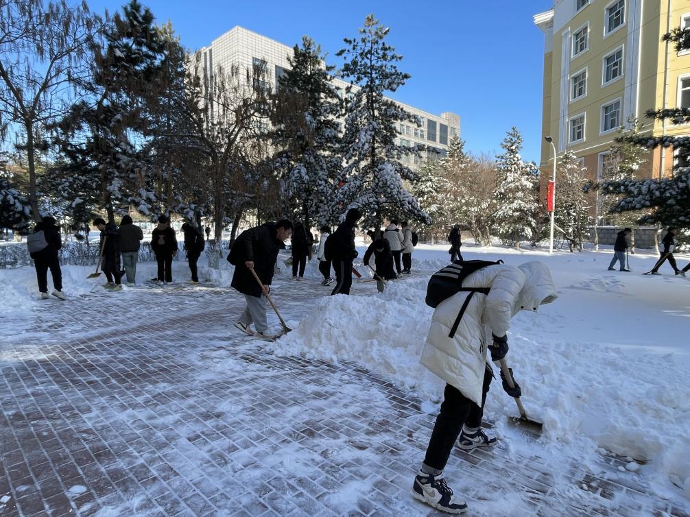 11月6日降雪后,全体辅导员迅速组织学生顶风冒雪、不畏严寒,挥动着铁锹、扫帚,整个校园呈现出一副热火朝天的清冰雪场面。